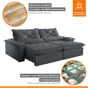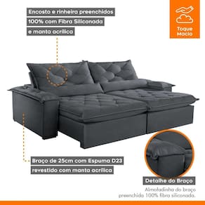 Possui também possui mecanismo retrátil em aço que permite abertura do sofá para sua maior comodidade. O braço é preenchido com fibra de silicone 100%.