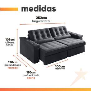 Importante sobre a entrega: A entrega é realizada até a portaria ou porta de entrada do endereço indicado, desde que o acesso seja permitido. Para locais com portaria, a entrega será feita no piso térreo. Não realizamos montagem, desmontagem, transporte por escadas ou içamento. É responsabilidade do cliente verificar se as dimensões do produto são compatíveis com portas, elevadores e corredores. Evite imprevistos: confira todos os detalhes antes de concluir sua compra. MEDIDAS:: A = 108 cm L = 252 cm P = 170 cm (Aberto) / 120 cm (Fechado) | PESO SUPORTADO POR ASSENTO:: 130 kg | PESO:: 100 kg | MODELO:: Sofá Retrátil e Reclinável 4 Lugares 2,52m Veludo Ilhéus | MARCA:: Bex's Estofados | ESTRUTURA:: Madeira de reflorestamento, oferecendo resistência, durabilidade e qualidade | TIPO DE SOFÁ:: Retrátil e reclinável com encosto ajustável em 3 posições para máximo conforto | MOLAS:: Molas ensacadas, garantindo firmeza e maciez no assento | ASSENTO:: Espuma HR26 de alta qualidade, que une conforto e longa vida útil, dentro dos padrões ABNT | QUANTIDADES DE LUGARES:: 4 lugares | ENCOSTO:: Fibra de silicone, removível que facilita transporte e reclinável com 3 posições | REVESTIMENTO:: Tecido em Veludo macio ao toque, com acabamento sofisticado | BRAÇOS:: Espuma, que oferecem apoio confortável | PÉS:: 8 unidades em plástico resistente, com rodízios que facilitam a movimentação | DIFERENCIAL:: Braços almofadados e almofadas decorativas soltas / Assentos com molas ensacadas e espumas HR26 / Encosto ajustável em 3 posições / Almofadas e braços em espuma e fibra de silicone. | INSTRUÇÕES E CUIDADOS:: Para manter a beleza do sofá, utilize pano úmido ou aspirador. Evite produtos abrasivos. | GARANTIA:: 3 Meses. | AVISO:: Importante sobre a entrega: A entrega é realizada até a portaria ou porta de entrada do endereço indicado, desde que o acesso seja permitido. Para locais com portaria, a entrega será feita no piso térreo. | É kit de fábrica: Não | Inclui manual de montagem: Sim | Quantidade de caixas de embalagem: 1 | Requer montagem: Sim | Cor: Cinza