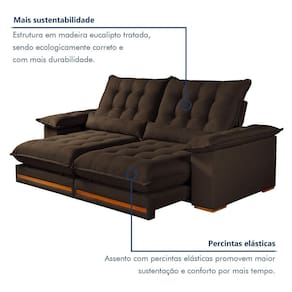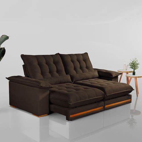 A almofada rinheira vem junto? Sim, vão duas. Produto Montado: Não Acompanha Almofadas extras: Não Almofada do assento: Fixa Almofada do encosto: Fixa Altura do assento até o chão: 50.0000 Altura do Encosto: 93 cm Altura dos Pés: 2,5 cm Altura Máxima dos Pés: 2.5000 Ambiente Principal: Sala de Estar codigo_ean: 7900288123862 Cor: Marrom Cor do Produto: Marrom Densidade do Assento: D-26 Enchimento do Assento: Espuma Enchimento do Encosto: Fibra Siliconada Estilo de Braço: Braços Quadrados Firmeza do Assento: Macio Itens Inclusos: 01 Sofá Largura do Braço: 25 cm Marca: Kasacomigo Estofados Material dos Pés: Eucalipto Necessita Montagem: Não Origem do Produto: Nacional Peso: 94,2 kg Pet Friendly: Não Possui Baú: Não Possui Mola: Sim Possui Percintas Elásticas: Sim Possui Pés: 08 Possui Rodízio: Sim Profundidade Quando Estendido: 180 cm Quantidade de Estágios do Encosto: 6 Quantidade de Molas por Assento: 2 Recomendações de Uso, Manutenção e Limpeza: Pano úmido Rodízio com Trava: Não Suporta Até (kg): 300 kg Tecido Predominante: Veludo Tipo de Encosto: Regulável Tipo de Mola: Molas Ensacadas Tipo de Sofá: Sofá Comum Marca: Kasacomigo Estofados