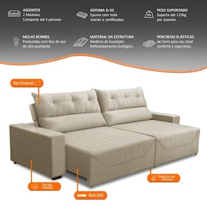 Encosto:Composto com enchimento de 80% fibra e 20% flocos que proporcionam maciez e conforto, além de possuir um kit de catracas com 3 estágios que te permite posicionar o encosto da maneira que mais lhe agrada.