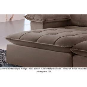 Características: Marca: TXR Modelo: Atlanta Tipo: Sofá 5 lugares Retrátil e Reclinável Estrutura: Madeira de origem certificada, Eucalipto Revestimento: Tecido Veludo Pés: Madeira Reflorestada Assento: Retrátil de duplo molejo - mola Bonnel + percinta tipo Italiana + Pillow de molas ensacadas com espuma D28 Encosto: Reclinável em 5 estágios, 100 fibra de silicone Braços: 25 cm com pillow 100 fibra de silicone Retrátil e Reclinável: Com mecanismo em aço