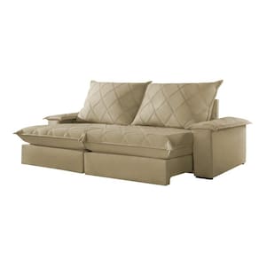 Experimente o máximo em conforto e estilo com nosso sofá retrátil e reclinável, o epítome do luxo moderno para sua sala de estar. Este sofá é mais do que um simples móvel; é um convite para o relaxamento supremo. Com seu design elegante e estofamento de alta qualidade, ele não só adiciona um toque de sofisticação ao seu espaço, mas também oferece a versatilidade de se ajustar às suas necessidades. Recline-se e relaxe após um longo dia de trabalho, ou estenda o sofá para receber seus convidados com conforto e hospitalidade. Produto Montado: Sim Acompanha Almofadas extras: Não Almofada do assento: Fixa Almofada do encosto: Removível Altura do assento até o chão: 50.0000 Altura do Encosto: 64 cm Altura dos Pés: 2,5 cm Ambiente Principal: Sala de Estar codigo_ean: 7909903646823 Complexidade da Montagem: Baixa: pode ser montado por uma pessoa sozinha Cor: Jolie/Bege Cor do Produto: Jolie/Bege Densidade do Assento: D-26 Enchimento do Assento: Espuma Enchimento do Encosto: Fibra Siliconada Firmeza do Assento: Firme Itens Inclusos: 1 Sofá e manual de instrução. Linha ou Coleção: Merlot Manual de Montagem e Instalação: https://product-hub-prd.madeiramadeira.com.br/903935/documents/00c4ece9-33c1-40ba-a535-189fe03e35d619019631.pdf Material dos Pés: Madeira Montagem Flex: Não Necessita Montagem: Sim Peso: 117 kg Pet Friendly: Não Possui Baú: Não Possui Percintas Elásticas: Sim Possui Pés: 08 Possui Rodízio: Sim Profundidade Quando Estendido: 175 cm Recomendações de Uso, Manutenção e Limpeza: Para limpar, utilize pano seco ou papel absorvente. Não armazenar em local úmido. Não usar produtos químicos como detergente, cloro, alvejantes entre outros. Evitar exposição a luz solar direta por longos períodos. O consumidor perderá total garantia se for detectado dano no produto causadas por animais! Revestimento do Braço: Espuma , manta acrilica Rodízio com Trava: Não Sistema de Montagem: Encaixe. Suporta Até (kg): 120 kg Tecido Predominante: Veludo Tipo de Encosto: Regulável