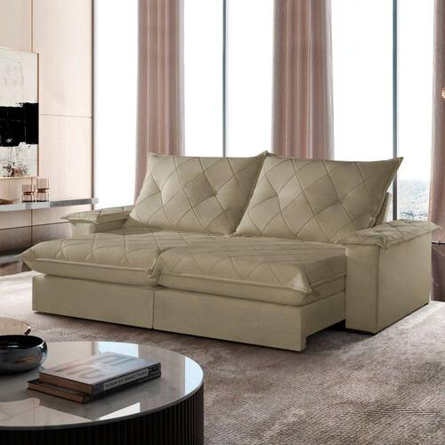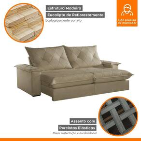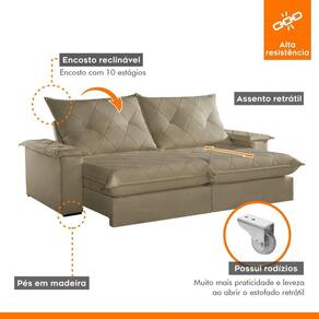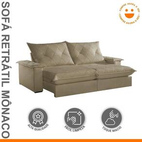 Experimente o máximo em conforto e estilo com nosso sofá retrátil e reclinável, o epítome do luxo moderno para sua sala de estar. Este sofá é mais do que um simples móvel; é um convite para o relaxamento supremo. Com seu design elegante e estofamento de alta qualidade, ele não só adiciona um toque de sofisticação ao seu espaço, mas também oferece a versatilidade de se ajustar às suas necessidades. Recline-se e relaxe após um longo dia de trabalho, ou estenda o sofá para receber seus convidados com conforto e hospitalidade. Produto Montado: Sim Acompanha Almofadas extras: Não Almofada do assento: Fixa Almofada do encosto: Removível Altura do assento até o chão: 50.0000 Altura do Encosto: 64 cm Altura dos Pés: 2,5 cm Ambiente Principal: Sala de Estar codigo_ean: 7909903646595 Complexidade da Montagem: Baixa: pode ser montado por uma pessoa sozinha Cor: Veludo Jolie/Bege Cor do Produto: Veludo Jolie/Bege Densidade do Assento: D-26 Enchimento do Assento: Espuma Enchimento do Encosto: Fibra Siliconada Firmeza do Assento: Firme Itens Inclusos: 1 Sofá e manual de instrução. Linha ou Coleção: Mônaco Manual de Montagem e Instalação: https://product-hub-prd.madeiramadeira.com.br/903912/documents/5d7d9a08-21c9-40e2-b643-7c464e1bb3bf19018781.pdf Material dos Pés: Madeira Montagem Flex: Não Necessita Montagem: Sim Peso: 117 kg Pet Friendly: Não Possui Baú: Não Possui Percintas Elásticas: Sim Possui Pés: 08 Possui Rodízio: Sim Profundidade Quando Estendido: 175 cm Recomendações de Uso, Manutenção e Limpeza: Para limpar, utilize pano seco ou papel absorvente. Não armazenar em local úmido. Não usar produtos químicos como detergente, cloro, alvejantes entre outros. Evitar exposição a luz solar direta por longos períodos. O consumidor perderá total garantia se for detectado dano no produto causadas por animais! Revestimento do Braço: Espuma , manta acrilica Rodízio com Trava: Não Sistema de Montagem: Encaixe. Suporta Até (kg): 120 kg Tecido Predominante: Veludo Tipo de Encosto: Regulável