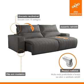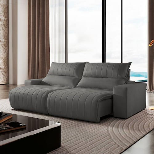Experimente o máximo em conforto e estilo com nosso sofá retrátil e reclinável, o epítome do luxo moderno para sua sala de estar. Este sofá é mais do que um simples móvel; é um convite para o relaxamento supremo. Com seu design elegante e estofamento de alta qualidade, ele não só adiciona um toque de sofisticação ao seu espaço, mas também oferece a versatilidade de se ajustar às suas necessidades. Recline-se e relaxe após um longo dia de trabalho, ou estenda o sofá para receber seus convidados com conforto e hospitalidade. Produto Montado: Sim Acompanha Almofadas extras: Não Almofada do assento: Fixa Almofada do encosto: Removível Altura do assento até o chão: 45.0000 Altura do Encosto: 61 cm Altura dos Pés: 2,5 cm Ambiente Principal: Sala de Estar codigo_ean: 7909903646427 Complexidade da Montagem: Baixa: pode ser montado por uma pessoa sozinha Cor: Veludo Jolie/Grafite Cor do Produto: Veludo Jolie/Grafite Densidade do Assento: D-26 Enchimento do Assento: Espuma Enchimento do Encosto: Fibra Siliconada Firmeza do Assento: Firme Itens Inclusos: 1 Sofá e manual de instrução. Linha ou Coleção: Palermo Manual de Montagem e Instalação: https://product-hub-prd.madeiramadeira.com.br/903895/documents/42aac805-fd80-406c-8e0a-3ff2e594867d19018961.pdf Material dos Pés: Madeira Montagem Flex: Não Necessita Montagem: Sim Peso: 115,97 kg Pet Friendly: Não Possui Baú: Não Possui Percintas Elásticas: Sim Possui Pés: 08 Possui Rodízio: Sim Profundidade Quando Estendido: 175 cm Recomendações de Uso, Manutenção e Limpeza: Para limpar, utilize pano seco ou papel absorvente. Não armazenar em local úmido. Não usar produtos químicos como detergente, cloro, alvejantes entre outros. Evitar exposição a luz solar direta por longos períodos. O consumidor perderá total garantia se for detectado dano no produto causadas por animais! Revestimento do Braço: Espuma , manta acrilica Rodízio com Trava: Não Sistema de Montagem: Encaixe. Suporta Até (kg): 120 kg Tecido Predominante: Veludo Tipo de Encosto: Regulável