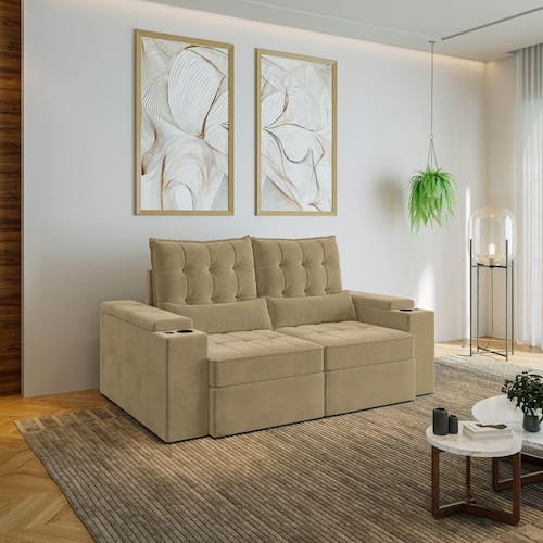 Os estofados retráteis Embaúba Extra combinam linhas econômicas e um design robusto, sem excessos, ideal para uma sala de estar ou home cinema com um estilo moderno e sofisticado, proporcionando conforto para toda a família. Com suas medidas amplas, são ideais para acomodar todos com comodidade. Além disso, apresentam uma ampla variedade de cores para se adaptarem a diferentes estilos de decoração. Os estofados também oferecem opções de cores em tecido de veludo fosco de fácil limpeza com resistência a manchas. O encosto possui uma catraca blindada de 7 estágios de reclinação, preenchida com 100% de fibra siliconada para máximo conforto. Além disso, os sofás possuem porta-copos e cabos USB integrados para uma experiência de entretenimento ainda mais conveniente. A estrutura, feita de eucalipto reflorestado, garante excelente resistência e durabilidade.