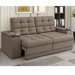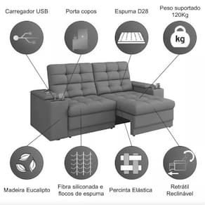 Estrutura: Madeira de Eucalipto de reflorestamentoRevestimento: Tecido Suede VeludoAssento: Retrátil, com percintas elásticas, enchimento em espuma D28, fibra e flocos de espuma, com altura de 15 cmEncosto: Reclinável, removível, com enchimento em fibra e flocos de espumaBraço: Fixo, com enchimento em espumaPés: Sim, em sapata PVCPorta USB: Sim, porta de entrada para carregamento do smartphone, necessita da fonte do smartphone para conetar na tomada de energiaPorta: Copo Sim, 02 porta-copos, sendo um em cada braço do sofáPeso Suportado: Suporta o peso de 120 kilosExtra: Apoio do braço deslizante, ou seja, quanto não tiver usando o porta-copos ou USB, você pode deslizar para tampar