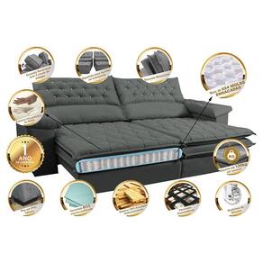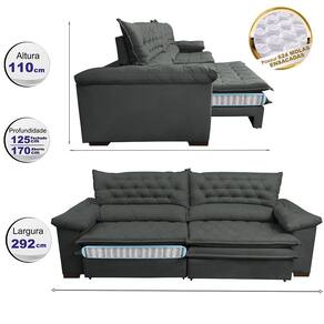 Características: -Revestimento: Suede Velusoft 100% Poliéster -Encosto Reclinável com 5 posições, almofadas fixas compostas de 80% fibra siliconada e 20% flocos de espuma e percintas elásticas que proporcionam maior conforto. -Assentos: Retráteis com espumas D33, com 312 Molas Ensacadas, camada de espumas cobertas por mais uma macia camada de fibra siliconada em seu Pilow TOP, percintas Pneumáticas com feltro para proteger do atrito com as molas. (Extremament resistente e confortável). -Braços: Com 25cm de largura e com espuma D33. -Fixação: Grampos galvanizados -Estrutura de Madeira maciça 100% eucalipto de reflorestamento, produto ecologicamente correto -Pés em PVC