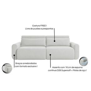 Material: O sofá possui estrutura em madeira de reflorestamento, assento retrátil com mecanismo metalico, espuma contínua D28 Supersoft de 16cm sustentado por 4 molas de aço e percinta sintética, encosto reclinável com catraca blindada em 7 posições, almofadas soltas com enchimento em fibra de silicone e rolinho em espuma D20 costurado ao assento e encosto. O revestimento é em linho 100% poliéster, os módulos retráteis contam com rodinhas de silicone, os pés são de madeira e o acabamento é em costura free, unindo conforto, resistência e elegância.