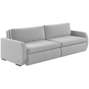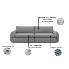 Material: O sofá possui estrutura em madeira de reflorestamento, assento retrátil com mecanismo metalico, pillow nos assentos com 16cm de espuma contínua D28 Supersoft sustentado por 4 molas de aço, encosto reclinável em 3 posições, almofadas soltas com enchimento em fibra de silicone. O revestimento é em linho 100% poliéster, os módulos retráteis contam com rodinhas de silicone, os pés são de madeira, unindo conforto, resistência e elegância.
