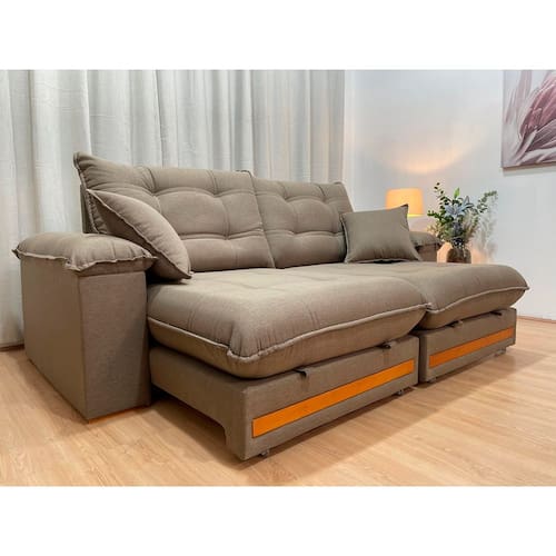 Sofá Retrátil Reclinável 2,10 m Linho Marrom A229 Gael Nosso Sofá Retrátil Reclinável 2,10 m Linho Marrom Gael é um produto moderno, com design elegante que deixa sua sala ainda mais linda e aconchegante. Além de ser retrátil e reclinavel ideal para esticar as pernas e descansar. MEDIDAS DO SOFÁ: Comprimento: 2.10 mProfundidade Fechado: 120 cmProfundidade Aberto: 170 cm Altura: 105 cm Assento: Retrátil com percintas elasticas, molas espiral, espuma D28, pillow top 25cm de altura, com molas ensacadas e matelassê o que proporcionam uma acomodação extremamente confortável. Encosto: Reclinavel, catraca blindada 90, almofadas com fibras de poliester siliconizada. Estrutura: Sua estrutura é com madeira de eucalipto, 100% reflorestada e seca em estufa, e os pés são produzidos em madeira e braços com Espuma 26. Revestimento: O revestimento é em tecido Linho, deixando a superfície do sofá muito mais macia.