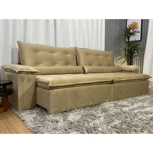 Sofá Retrátil Reclinável 2,30 m Bege 511 Tijuca Plus Nosso Sofá Retrátil Reclinável Tijuca Plus é um produto autêntico, com design elegante que combina com qualquer ambiente e deixa sua sala ainda mais linda, aconchegante e moderna. MEDIDAS DO SOFÁ: Altura: 1.10 m Largura: 2.30 m Profundidade Sofá fechado: 90 cm Sofá aberto Reclinável da ponta da almofada até o encosto: 1.60 m Assento: O assento retrátil contem espuma AG 33 Fibra de silicone e percinta elástica que proporcionam uma acomodação extremamente confortável. Encosto: O encosto reclinável é feito com espuma 100% fibra de silicone. Além disso, as catracas são de ferro blindado com várias posições de inclinação, trazendo mais conforto para você na hora do descanso. Estrutura: Sua estrutura é com madeira de eucalipto, 100% reflorestada e seca em estufa, e os pés são produzidos em madeira e rodízio de silicone Revestimento: O revestimento é em tecido veludão, deixando a superfície do sofá muito mais macia. Braços: Braços com Fibra de silicone. * As imagens dos produtos são meramente ilustrativas. As cores podem sofrer variações dependendo da luminosidade, tipo de câmera ou mesmo da visualização das imagens em computadores, notebooks com telas LCD ou LED, tablets ou smartphones, dependendo da quantidade de pixels, podendo deixar as imagens com cores mais opacas ou cores mais vibrantes. Marca: Não Informado