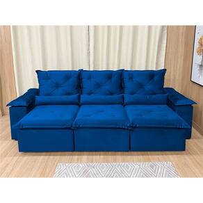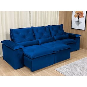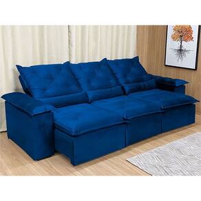 Sofá Retrátil Reclinável 2,70 m Azul 206 Athenas Nosso Sofá Retrátil Reclinável 2,70 m Azul 206 Athenas é um produto moderno, com design elegante que combina com qualquer ambiente e deixa sua sala ainda mais linda e aconchegante. MEDIDAS DO SOFÁ: Altura: 1.10 mLargura: 2.70 mProfundidade fechado: 90 cmProfundidade aberto: 1.65 m Assento: O assento retrátil contem espuma com pilow top de 13 cm de altura, percinta elástica, que proporcionam uma acomodação extremamente confortável. Encosto: O encosto reclinável é feito com espuma 100% fibra de silicone. Além disso, as catracas são de ferro blindado com várias posições de inclinação, trazendo mais conforto para você na hora do descanso. Estrutura: Sua estrutura é com madeira de eucalipto, 100% reflorestada e seca em estufa, e os pés são produzidos em madeira e rodízio de silicone Revestimento: O revestimento é em tecido veludinho, deixando a superfície do sofá muito mais macia. Braços: Braços com Fibra de silicone.