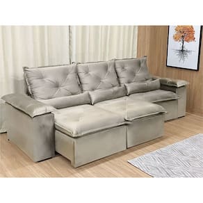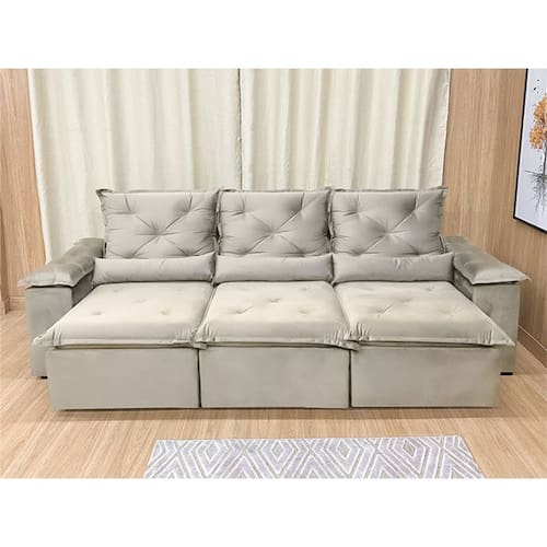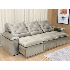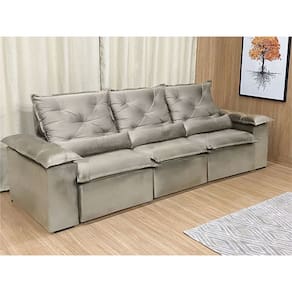 Sofá Retrátil Reclinável 2,70 m Bege 201 Athenas Nosso Sofá Retrátil Reclinável 2,70 m Bege 201 Athenas é um produto moderno, com design elegante que combina com qualquer ambiente e deixa sua sala ainda mais linda e aconchegante. MEDIDAS DO SOFÁ: Altura: 1.10 mLargura: 2.70 mProfundidade fechado: 90 cmProfundidade aberto: 1.65 m Assento: O assento retrátil contem espuma com pilow top de 13 cm de altura, percinta elástica, que proporcionam uma acomodação extremamente confortável. Encosto: O encosto reclinável é feito com espuma 100% fibra de silicone. Além disso, as catracas são de ferro blindado com várias posições de inclinação, trazendo mais conforto para você na hora do descanso. Estrutura: Sua estrutura é com madeira de eucalipto, 100% reflorestada e seca em estufa, e os pés são produzidos em madeira e rodízio de silicone Revestimento: O revestimento é em tecido veludinho, deixando a superfície do sofá muito mais macia. Braços: Braços com Fibra de silicone.