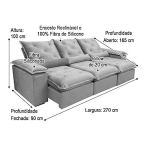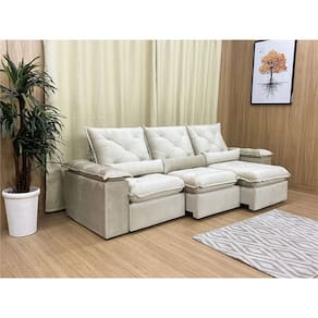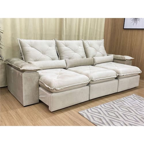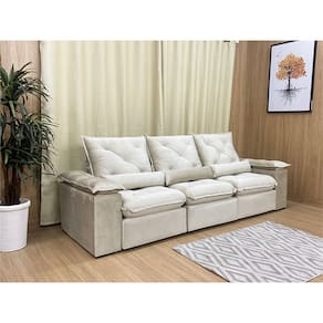 Sofá Retrátil Reclinável 2,70 m Bege 501 Zuqui Plus Nosso Sofá Retrátil Reclinável Zuqui Plus é um produto moderno, com design elegante que combina com qualquer ambiente e deixa sua sala ainda mais linda e aconchegante. MEDIDAS DO SOFÁ: Altura: 1.00 mLargura: 2.70 mProfundidade fechado: 0.90 mProfundidade aberto: 1.65 m Assento: O assento com Pillow top 20cm é retrátil com espuma 28, contem também percinta elástica e molas bonel, que proporcionam uma acomodação extremamente confortável. Almofadas com fibras de poliéster siliconada. Encosto: O Encosto reclinável com espuma 100% fibra de silicone, trazendo mais conforto para você na hora do seu descanso. Braços: Os Braços são com espuma fibra de silicone Estrutura: Sua estrutura é com madeira de eucalipto, 100% reflorestada e seca em estufa, e os pés são produzidos em madeira e rodízio de silicone Revestimento: O revestimento é em tecido veludão Premium, deixando a superfície do sofá muito mais macia. * As imagens dos produtos são meramente ilustrativas