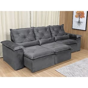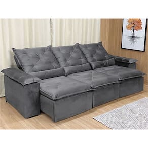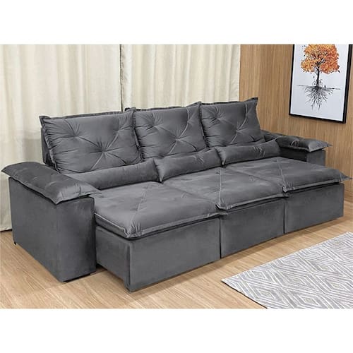 Sofá Retrátil Reclinável 2,70 m Cinza 202 Athenas Nosso Sofá Retrátil Reclinável 2,70 m Cinza 202 Athenas é um produto moderno, com design elegante que combina com qualquer ambiente e deixa sua sala ainda mais linda e aconchegante. MEDIDAS DO SOFÁ: Altura: 1.10 mLargura: 2.70 mProfundidade fechado: 90 cmProfundidade aberto: 1.65 m Assento: O assento retrátil contem espuma com pilow top de 13 cm de altura, percinta elástica, que proporcionam uma acomodação extremamente confortável. Encosto: O encosto reclinável é feito com espuma 100% fibra de silicone. Além disso, as catracas são de ferro blindado com várias posições de inclinação, trazendo mais conforto para você na hora do descanso. Estrutura: Sua estrutura é com madeira de eucalipto, 100% reflorestada e seca em estufa, e os pés são produzidos em madeira e rodízio de silicone Revestimento: O revestimento é em tecido veludinho, deixando a superfície do sofá muito mais macia. Braços: Braços com Fibra de silicone. * As imagens dos produtos são meramente ilustrativas.