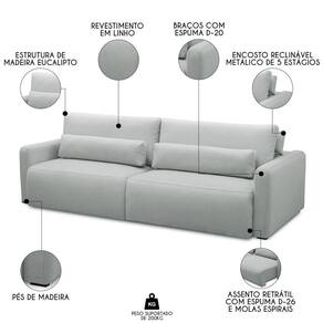 Ele tem um design moderno e elegante, com linhas retas e cores neutras que combinam com qualquer decoração. O Sofá 3 Lugares tem 8 pés de madeira, que garantem a estabilidade e a resistência do móvel. Além disso, ele tem 4 almofadas soltas que podem ser usadas como apoio ou como travesseiros. Um Sofá Retrátil e reclinável, que se adapta às suas preferências e necessidades. Você pode esticar as pernas no assento retrátil, que tem espuma D-26, molas ensacadas, molas espirais e rodízios de silicone, que proporcionam um conforto incomparável. Você também pode reclinar o encosto em 5 estágios diferentes, que tem fibra siliconadas, que oferecem um suporte macio para as costas. Os braços do são compostos por espuma D-20, que são firmes e aconchegantes. Ah! E o melhor, ele é revestido com linho impermeabilizado, ou seja, a qualidade do linho com uma proteção ainda maior, a impermeabilização de tecido tem a duração de um ano em média e traz mais praticidade também na hora da limpeza.