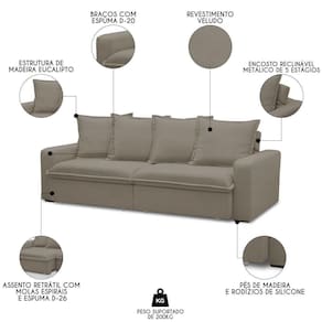 Esse modelo é ideal para quem busca conforto e qualidade, pois possui 3 lugares, uma estrutura de madeira de eucalipto tratada e resistente, além de um revestimento macio e suave ao toque. O Sofá tem encosto reclinável com cinco estágios de ajuste, para você relaxar como quiser, e assento retrátil com espuma D-26, molas ensacadas, molas espirais e rodízios de silicone, que garantem maior durabilidade e estabilidade. Os braços também são estofados com espuma D-20, para você apoiar os cotovelos sem desconforto. O design elegante do Sofá 3 Lugares combina com qualquer decoração e traz mais charme e beleza para o seu lar. Sem dúvidas essa é a hora de ter um sofá incrível na sua sala de estar!