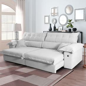 Além de seu conforto exuberante, o Estofado Retrátil Ravena está equipado com acessórios modernos para atender às demandas do estilo de vida contemporâneo. Com um carregador USB e USB-C embutido, você pode recarregar seus dispositivos eletrônicos enquanto relaxa, mantendo-se sempre conectado sem comprometer sua comodidade. Produto Montado: Não Acompanha Almofadas extras: 02 Almofada do assento: Fixa Almofada do encosto: Fixa Altura do assento até o chão: 48.0000 Altura do Encosto: 72 cm Altura dos Pés: 4 cm Ambiente Principal: Sala de Estar codigo_ean: 7909903665749 Cor: Branco Cor do Produto: Branco Densidade do Assento: Camadas de Densidades Diferentes Enchimento do Assento: Espuma Firmeza do Assento: Macio Itens Inclusos: 1 Sofa com 2 modulos e manual de montagem Material dos Pés: Madeira Necessita Montagem: Não Peso: 120 kg Pet Friendly: Não Possui Percintas Elásticas: Sim Possui Pés: 04 Possui Rodízio: Sim Profundidade Quando Estendido: 180 cm Recomendações de Uso, Manutenção e Limpeza: Evite colocar objetos pontiagudos ou pesados ??nos assentos, pois isso pode danificar a estrutura ou os movimentos retráteis/reclináveis. Evite pular ou se jogar sobre o estofado, pois isso pode causar ferimentos. Certifique-se de que as pessoas que se sentam no estofado estejam dentro da capacidade de peso recomendada. Evite expor o estofado à luz solar direta ou a fontes de calor excessivo, pois isso pode desbotar o tecido ou causar danos. Rodízio com Trava: Não Suporta Até (kg): 120 kg Tipo de Encosto: Regulável Tipo de Mola: Molas Ensacadas