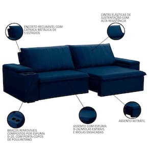 O Sofá Retrátil Reclinável 3 Lugares 245cm Baluart F05 Veludo Azul, da Mpozenato, é um estofado elegante e aconchegante, que combina estilo e conforto. Com um design moderno e clean, esse sofá 3 lugares é perfeito para qualquer sala de estar, pois, além de proporcionar um espaço acolhedor e relaxante para você e seus convidados, ainda harmoniza facilmente com diversos estilos de decoração.