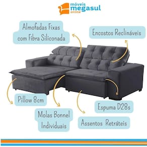 Ao chegar em casa nada melhor que o aconchego de um sofá extravagante em conforto, por isso conte com o Sofá 3 Lugares Retrátil e Reclinável Alasca 2,00m na cor CINZA, fabricado pela MegaSul, possui encosto reclinável, com catraca silenciosa 5 estágios, almofadas fixas de fibra siliconada. Perfeito para seus momentos de descanso e descontração! Valorize e complete o seu lar com muita beleza e funcionalidade! Aproveite e experimente o novo! O tecido veludo é de alto padrão, depois da seda, é um dos tecidos mais nobres. Possui textura ricamente macia e suave, associado a classe e elegância com a proposta de sensação ao toque mais sensível e encantador. Além de trazer sofisticação para o produto, ter variações de cores extremamente modernas, que agregam na decoração do seu ambiente, com o ar de sofisticação, mais decorativo. Estrutura do Sofá 3 Lugares Retrátil e Reclinável Alasca é eucalipto tratado de reflorestamento ecologicamente correto. O assento é retrátil, pillow, espuma D-28, revestido com manta fibra siliconada, contém molas individuais bonnel, corrediça metálica e percinta elástica. Dados Técnicos do Sofá 3 Lugares Retrátil e Reclinável Alasca: Largura: 2,00m Altura: 1,05m Profundidade com assento fechado: 1,15m Profundidade com assento aberto: 1,70m Cor:CINZA OBS: Estofado disponível em 8 cores em tecido veludo de alta qualidade. * Para escolher outra a cor, informe o código nas observações adicionais ao finalizar a compra. Tecido/Revestimento: Veludo Informações Adicionais: Garantia de 90 dias para defeitos de fabricação; Limpeza ou Manutenção: Utilizar escova com cerdas macias. NÃO utilizar produtos Abrasivos. Tecido/Revestimento: Veludo Montagem e instalação por conta do comprador; As imagens ambientadas são meramente ilustrativas e podem apresentar itens que não compõe o produto; As cores do produto podem variar de acordo com o monitor, a iluminação do ambiente ou sua percepção visual.