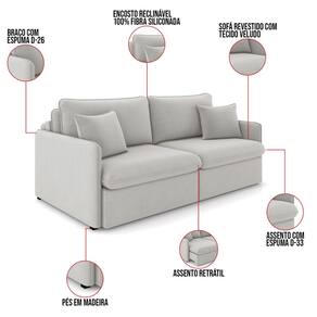 Diferenciais: Almofadas Decorativas Soltas; Assento com percintas elasticas, molas espirais ensacadas e manta acrílica. Encosto reclinável com percintas elasticas.