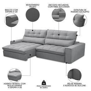 O Sofá Retrátil Reclinável 4 Lugares 290cm Damy F05 Veludo Cinza, da Mpozenato é uma ótima escolha para quem busca conforto e beleza na hora de decorar a Sala De Estar.