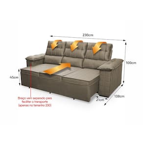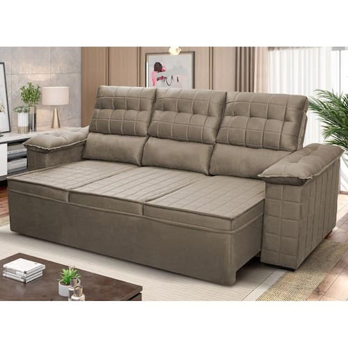 Ele possui encosto reclinável em cinco posições, proporcionando-lhe mais conforto na hora do descanso. Não para por aí: seu assento retrátil conta com espuma D23 e molas bonnel, transformando seu sofá em uma verdadeira cama para assistir seu filme preferido.