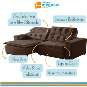 Ao chegar em casa nada melhor que o aconchego de um sofá extravagante em conforto, por isso conte com o Sofá 4 Lugares Retrátil e Reclinável Alasca 2,30m na cor Marrom, fabricado pela MegaSul, possui encosto reclinável, com catraca silenciosa 5 estágios, almofadas fixas de fibra siliconada. Perfeito para seus momentos de descanso e descontração! Valorize e complete o seu lar com muita beleza e funcionalidade! Aproveite e experimente o novo! O tecido veludo é de alto padrão, depois da seda, é um dos tecidos mais nobres. Possui textura ricamente macia e suave, associado a classe e elegância com a proposta de sensação ao toque mais sensível e encantador. Além de trazer sofisticação para o produto, ter variações de cores extremamente modernas, que agregam na decoração do seu ambiente, com o ar de sofisticação, mais decorativo. Estrutura do Sofá 4 Lugares Retrátil e Reclinável Alasca é eucalipto tratado de reflorestamento ecologicamente correto. O assento é retrátil, pillow, espuma D-28, revestido com manta fibra siliconada, contém molas individuais bonnel, corrediça metálica e percinta elástica. Dados Técnicos do Sofá 4 Lugares Retrátil e Reclinável Alasca: Largura: 2,30m Altura: 1,05m Profundidade com assento fechado: 1,15m Profundidade com assento aberto: 1,70m Cor: Marrom escuro OBS: Estofado disponível em 8 cores em tecido veludo de alta qualidade. * Para escolher outra a cor, informe o código nas observações adicionais ao finalizar a compra. Tecido/Revestimento: Veludo Informações Adicionais: Garantia de 90 dias para defeitos de fabricação; Limpeza ou Manutenção: Utilizar escova com cerdas macias. NÃO utilizar produtos Abrasivos. Tecido/Revestimento: Veludo Montagem e instalação por conta do comprador; As imagens ambientadas são meramente ilustrativas e podem apresentar itens que não compõe o produto; As cores do produto podem variar de acordo com o monitor, a iluminação do ambiente ou sua percepção visual.