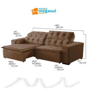 Ao chegar em casa nada melhor que o aconchego de um sofá extravagante em conforto, por isso conte com o Sofá 6 Lugares Retrátil e Reclinável Alasca 2,90m na cor Marrom, fabricado pela MegaSul, possui encosto reclinável, com catraca silenciosa 5 estágios, almofadas fixas de fibra siliconada. Perfeito para seus momentos de descanso e descontração! Valorize e complete o seu lar com muita beleza e funcionalidade! Aproveite e experimente o novo! O tecido SUEDE oferece uma boa resistência a manchas e ainda danos devido a umidade e por isso é bastante durável. Estrutura do Sofá 6 Lugares Retrátil e Reclinável Alasca é eucalipto tratado de reflorestamento ecologicamente correto. O assento é retrátil, pillow, espuma D-28, revestido com manta fibra siliconada, contém molas individuais bonnel, corrediça metálica e percinta elástica. Dados Técnicos do Sofá 6 Lugares Retrátil e Reclinável Alasca: Largura: 2,90m Altura: 1,05m Profundidade com assento fechado: 1,15m Profundidade com assento aberto: 1,70m Cor: MARROM Revestimento: SUEDE - CLASSE A OBS: Estofado disponível em mais de 10 cores em tecido veludo de alta qualidade. * Para escolher outra a cor, informe o código nas observações adicionais ao finalizar a compra. Caso tenha alguma dúvida, ou não consiga escolher a cor durante a compra, Após a compra nosso atendimento entrará em contato com você para confirmar a COR, fique tranquila (o). Informações Adicionais: Garantia de 90 dias para defeitos de fabricação; Limpeza ou Manutenção: Utilizar escova com cerdas macias. NÃO utilizar produtos Abrasivos. Montagem e instalação por conta do comprador; As imagens ambientadas são meramente ilustrativas e podem apresentar itens que não compõe o produto; As cores do produto podem variar de acordo com o monitor, a iluminação do ambiente ou sua percepção visual. Informações sobre a entrega: VERIFIQUE as MEDIDAS para garantir que o sofá passe na porta e nos corredores de sua residência; NÃO NOS RESPONSABILIZAMOS por SUBIR o sofá por ESCADAS, NEM IÇAR o sofá;