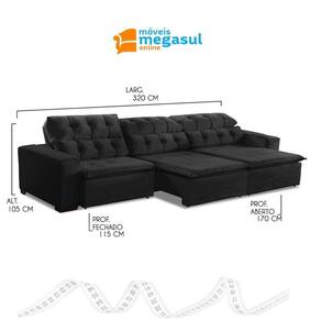 Ao chegar em casa nada melhor que o aconchego de um sofá extravagante em conforto, por isso conte com o Sofá 06 Lugares Retrátil e Reclinável Alasca 3,20 m na cor PRETO, fabricado pela MegaSul, possui encosto reclinável, com catraca silenciosa 5 estágios, almofadas fixas de fibra siliconada. Perfeito para seus momentos de descanso e descontração! Valorize e complete o seu lar com muita beleza e funcionalidade! Aproveite e experimente o novo! O tecido veludo é de alto padrão, depois da seda, é um dos tecidos mais nobres. Possui textura ricamente macia e suave, associado a classe e elegância com a proposta de sensação ao toque mais sensível e encantador. Além de trazer sofisticação para o produto, ter variações de cores extremamente modernas, que agregam na decoração do seu ambiente, com o ar de sofisticação, mais decorativo. Estrutura do Sofá 06 Lugares Retrátil e Reclinável Alasca é eucalipto tratado de reflorestamento ecologicamente correto. O assento é retrátil, pillow, espuma D-28, revestido com manta fibra siliconada, contém molas individuais bonnel, corrediça metálica e percinta elástica. Dados Técnicos do Sofá 6 Lugares Retrátil e Reclinável Alasca: Largura:3,20 m Altura: 1,05m Profundidade com assento fechado: 1,15m Profundidade com assento aberto: 1,70m 3 Módulos de 90 CM 2 Braços de 25 Cm cada. Cor: Preto OBS: Estofado disponível em mais de 10 cores em tecido veludo de alta qualidade. * Para escolher outra a cor, informe o código nas observações adicionais ao finalizar a compra. Caso tenha alguma dúvida, ou não consiga escolher a cor durante a compra, Após a compra nosso atendimento entrará em contato com você para confirmar a COR e o TECIDO, fique tranquila (o). Tecido/Revestimento: Veludo Informações Adicionais: Garantia de 90 dias para defeitos de fabricação; Limpeza ou Manutenção: Utilizar escova com cerdas macias. NÃO utilizar produtos Abrasivos. Tecido/Revestimento: Veludo Montagem e instalação por conta do comprador; As imagens ambientadas são meramente ilustrativas e podem apresentar itens que não compõe o produto; As cores do produto podem variar de acordo com o monitor, a iluminação do ambiente ou sua percepção visual. Informações sobre a entrega: VERIFIQUE as MEDIDAS para garantir que o sofá passe na porta e nos corredores de sua residência; NÃO NOS RESPONSABILIZAMOS por SUBIR o sofá por ESCADAS, NEM IÇAR o sofá;