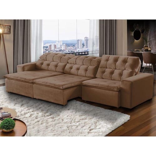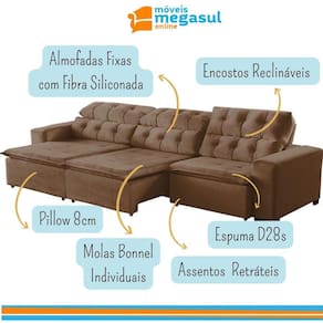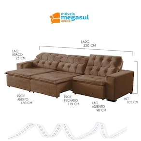 Ao chegar em casa nada melhor que o aconchego de um sofá extravagante em conforto, por isso conte com o Sofá 06 Lugares Retrátil e Reclinável Alasca 3,20 m na cor MARROM, fabricado pela MegaSul, possui encosto reclinável, com catraca silenciosa 5 estágios, almofadas fixas de fibra siliconada. Perfeito para seus momentos de descanso e descontração! Valorize e complete o seu lar com muita beleza e funcionalidade! Aproveite e experimente o novo! O tecido veludo é de alto padrão, depois da seda, é um dos tecidos mais nobres. Possui textura ricamente macia e suave, associado a classe e elegância com a proposta de sensação ao toque mais sensível e encantador. Além de trazer sofisticação para o produto, ter variações de cores extremamente modernas, que agregam na decoração do seu ambiente, com o ar de sofisticação, mais decorativo. Estrutura do Sofá 06 Lugares Retrátil e Reclinável Alasca é eucalipto tratado de reflorestamento ecologicamente correto. O assento é retrátil, pillow, espuma D-28, revestido com manta fibra siliconada, contém molas individuais bonnel, corrediça metálica e percinta elástica. Dados Técnicos do Sofá 6 Lugares Retrátil e Reclinável Alasca: Largura:3,20 m Altura: 1,05m Profundidade com assento fechado: 1,15m Profundidade com assento aberto: 1,70m 3 Módulos de 90 CM 2 Braços de 25 Cm cada. Cor: Marrom 512 OBS: Estofado disponível em mais de 10 cores em tecido veludo de alta qualidade. * Para escolher outra a cor, informe o código nas observações adicionais ao finalizar a compra. Caso tenha alguma dúvida, ou não consiga escolher a cor durante a compra, Após a compra nosso atendimento entrará em contato com você para confirmar a COR e o TECIDO, fique tranquila (o). Tecido/Revestimento: Veludo Informações Adicionais: Garantia de 90 dias para defeitos de fabricação; Limpeza ou Manutenção: Utilizar escova com cerdas macias. NÃO utilizar produtos Abrasivos. Tecido/Revestimento: Veludo Montagem e instalação por conta do comprador; As imagens ambientadas são meramente ilustrativas e podem apresentar itens que não compõe o produto; As cores do produto podem variar de acordo com o monitor, a iluminação do ambiente ou sua percepção visual. Informações sobre a entrega: VERIFIQUE as MEDIDAS para garantir que o sofá passe na porta e nos corredores de sua residência; NÃO NOS RESPONSABILIZAMOS por SUBIR o sofá por ESCADAS, NEM IÇAR o sofá;