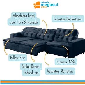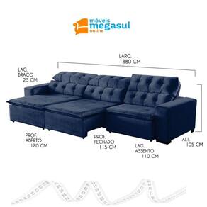 Ao chegar em casa nada melhor que o aconchego de um sofá extravagante em conforto, por isso conte com o Sofá 08 Lugares Retrátil e Reclinável Alasca 3,80 m na cor Bege, fabricado pela MegaSul, possui encosto reclinável, com catraca silenciosa 5 estágios, almofadas fixas de fibra siliconada. Perfeito para seus momentos de descanso e descontração! Valorize e complete o seu lar com muita beleza e funcionalidade! Aproveite e experimente o novo! O tecido veludo é de alto padrão, depois da seda, é um dos tecidos mais nobres. Possui textura ricamente macia e suave, associado a classe e elegância com a proposta de sensação ao toque mais sensível e encantador. Além de trazer sofisticação para o produto, ter variações de cores extremamente modernas, que agregam na decoração do seu ambiente, com o ar de sofisticação, mais decorativo. Estrutura do Sofá 08 Lugares Retrátil e Reclinável Alasca é eucalipto tratado de reflorestamento ecologicamente correto. O assento é retrátil, pillow, espuma D-28, revestido com manta fibra siliconada, contém molas individuais bonnel, corrediça metálica e percinta elástica. Dados Técnicos do Sofá 4 Lugares Retrátil e Reclinável Alasca: Largura:3,80 m Altura: 1,05m Profundidade com assento fechado: 1,15m Profundidade com assento aberto: 1,70m 3 Módulos de 110 CM Braços de 25 cm cada Cor: Azul OBS: Estofado disponível em 8 cores em tecido veludo de alta qualidade. * Para escolher outra a cor, informe o código nas observações adicionais ao finalizar a compra. Tecido/Revestimento: Veludo Informações Adicionais: Garantia de 90 dias para defeitos de fabricação; Limpeza ou Manutenção: Utilizar escova com cerdas macias. NÃO utilizar produtos Abrasivos. Tecido/Revestimento: Veludo Montagem e instalação por conta do comprador; As imagens ambientadas são meramente ilustrativas e podem apresentar itens que não compõe o produto; As cores do produto podem variar de acordo com o monitor, a iluminação do ambiente ou sua percepção visual.
