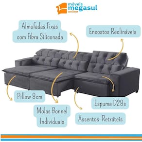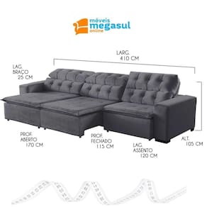Ao chegar em casa nada melhor que o aconchego de um sofá extravagante em conforto, por isso conte com o Sofá 09 Lugares Retrátil e Reclinável Alasca 4,10 m na cor Bege, fabricado pela MegaSul, possui encosto reclinável, com catraca silenciosa 5 estágios, almofadas fixas de fibra siliconada. Perfeito para seus momentos de descanso e descontração! Valorize e complete o seu lar com muita beleza e funcionalidade! Aproveite e experimente o novo! O tecido veludo é de alto padrão, depois da seda, é um dos tecidos mais nobres. Possui textura ricamente macia e suave, associado a classe e elegância com a proposta de sensação ao toque mais sensível e encantador. Além de trazer sofisticação para o produto, ter variações de cores extremamente modernas, que agregam na decoração do seu ambiente, com o ar de sofisticação, mais decorativo. Estrutura do Sofá 09 Lugares Retrátil e Reclinável Alasca é eucalipto tratado de reflorestamento ecologicamente correto. O assento é retrátil, pillow, espuma D-28, revestido com manta fibra siliconada, contém molas individuais bonnel, corrediça metálica e percinta elástica. Dados Técnicos do Sofá 9 Lugares Retrátil e Reclinável Alasca: Largura:4,10 m Altura: 1,05m Profundidade com assento fechado: 1,15m Profundidade com assento aberto: 1,70m 3 Módulos de 120 CM Braços de 25 cm cada Cor: 522 OBS: Estofado disponível em mais de 10 cores em tecido veludo de alta qualidade. * Para escolher outra a cor, informe o código nas observações adicionais ao finalizar a compra. Caso tenha alguma dúvida, ou não consiga escolher a cor durante a compra, Após a compra nosso atendimento entrará em contato com você para confirmar a COR e o TECIDO, fique tranquila (o). Tecido/Revestimento: Veludo Informações Adicionais: Garantia de 90 dias para defeitos de fabricação; Limpeza ou Manutenção: Utilizar escova com cerdas macias. NÃO utilizar produtos Abrasivos. Tecido/Revestimento: Veludo Montagem e instalação por conta do comprador; As imagens ambientadas são meramente ilustrativas e podem apresentar itens que não compõe o produto; As cores do produto podem variar de acordo com o monitor, a iluminação do ambiente ou sua percepção visual. Informações sobre a entrega: VERIFIQUE as MEDIDAS para garantir que o sofá passe na porta e nos corredores de sua residência; NÃO NOS RESPONSABILIZAMOS por SUBIR o sofá por ESCADAS, NEM IÇAR o sofá;