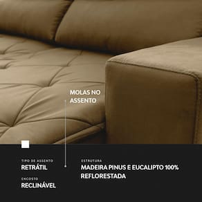 Ele possui encosto reclinável em cinco posições, proporcionando-lhe mais conforto na hora do descanso. Não para por aí: seu assento retrátil conta com espuma D28 e molas espirais, transformando seu sofá em uma verdadeira cama para assistir seu filme preferido.