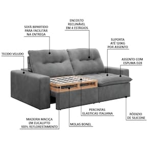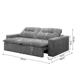 MEDIDA SOFÁ: [ A ] = 105 cm [ L ] = 230 cm [ P ] = 105 cm / 160 cm (Aberto) QUANTO SUPORTA POR ASSENTO: 120kg Por Assento PESO: 67 kg MODELO: Sofá Retrátil e Reclinável Napoli 2,30m 4 Lugares Veludo com Molas no Assento Bipartido Selmer MARCA: Selmer COR: Cinza TECIDO: Veludo PERCINTAS: Elásticas Italiana MATERIAL DA ESTRUTURA: Madeira Eucalipto MATERIAL DO ASSENTO: Espuma DENSIDADE DE ESPUMA: D28 QUANTIDADE DE LUGARES: 4 MATERIAL DO ENCOSTO: Espuma MOLAS: Sim, Bonel POSSUI ENCOSTO REMOVÍVEL: Sim MATERIAL DO BRAÇO: Fibra Siliconizada ENCOSTO: Reclinável 4 estágios TIPO DE SOFÁ: Retrátil e Reclinável RODÍZIOS: Sim, 4 PÉS: 8 MATERIAL DOS PÉS: PVC GARANTIA: 3 Meses
