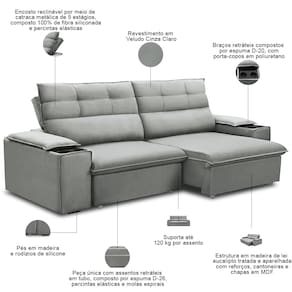 Com seu mecanismo retrátil e reclinável, você ajusta cada detalhe para criar a posição ideal - seja para maratonar sua série favorita, ler um bom livro ou receber amigos com todo o aconchego. Além disso, o design sofisticado surpreende pela funcionalidade: equipado com porta-copos integrados, mantém tudo ao alcance das mãos durante seus momentos de relaxamento. A combinação de molas espirais e espuma D-26 de alta densidade garante um apoio perfeito para o corpo, oferecendo conforto que dura horas sem perder a firmeza.