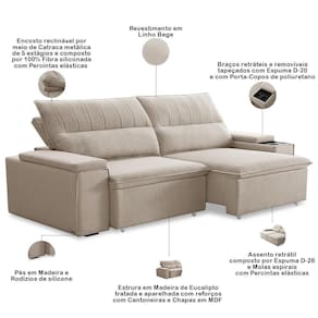 Altura: 110 cm | Color: Bege | ColorFamily: Bege | ColorSimple: Bege | ColorSupplier: Bege | Cor: Bege | Densidade da espuma do assento: D-26 | Desenho do tecido: Liso | Estilo: Moderno | Fabricante: Lyam Decor | Formato do sofá: Linear | Largura: 205 cm | Linha: Sala de Estar, Living | Material: Madeira de Eucalipto, Cantoneiras, Chapas em MDF | Material de enchimento do encosto: Fibra Siliconada | Material do estofamento: Linho | MaterialFamily: Madeira de Eucalipto | Mecanismo de abertura do produto: Manual | Model: Ricci | Orientação do Sofá: Frontal | OriginCountry: Brasil | OriginState: PR | Peso: 60 Kg | Peso máximo suportado: 360 kg | ProductContents: 01 Sofá | ProductHeight: 110 cm | ProductInstructions: Produto para uso em ambiente interno, nao devendo ficar exposto ao sol, calor e umidade excessivos. | ProductLength: 98 cm | ProductWarranty: 90 dias após o recebimento do produto | ProductWeight: 60 kg | ProductWidth: 205 cm | Profundidade: 98 cm | Quantidade de Caixas de embalagem: 1 | Requer montagem: Não | SizeDescription: Altura: 110 cm x Largura: 205 cm x Profundidade: 98 cm | SupplierSimpleName: Sofá Retrátil Reclinável Para Sala 3 Lugares 205cm Ricci F04 Linho Bege - Lyam Decor | Tipo de produto: Sofá Retrátil Reclinável | Unidades por kit: 1