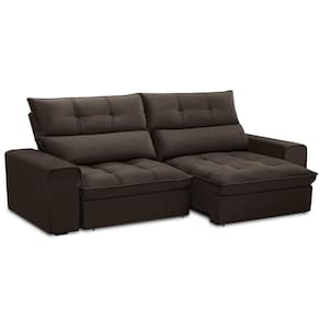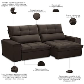 Unidades por kit: 1 | Cor: Marrom Escuro | Requer montagem: Não | Altura: 110 cm | Tipo de produto: Sofá Retrátil Reclinável | Peso máximo suportado: 240 kg | Peso: 65 Kg | Orientação do Sofá: Frontal | Mecanismo de abertura do produto: Manual, rodízios de silicone | Material do estofamento: Veludo | Material de enchimento do encosto: Fibra Siliconada | Linha: Sala de Estar | Formato do sofá: Linear | Estilo: Moderno | Desenho do tecido: Liso | Fabricante: Lyam Decor | Largura: 210 cm | Densidade da espuma do assento: D-26 | Cor dos pés: Marrom | Profundidade: 95 cm | Quantidade de Caixas de embalagem: 1