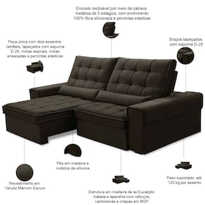 Peça única com dois assentos retráteis, tapeçados com espuma D-26, molas ensacadas e molas espirais.
