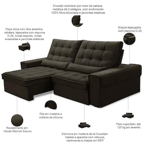 Desenho do tecido: Liso | Densidade da espuma do assento: D-26 | Largura: 210 cm | Cor dos pés: Marrom | Profundidade: 121 cm | Quantidade de Caixas de embalagem: 1 | Peso: 70 kg | Material do estofamento: Veludo | Peso máximo suportado: 240 kg | Unidades por kit: 1 | Tipo de produto: Sofá Retrátil Reclinável | Orientação do Sofá: Frontal | Estilo: Moderno | Formato do sofá: Linear | Cor: Marrom Escuro | Mecanismo de abertura do produto: Manual, rodízios de silicone | Altura: 115 cm | Fabricante: Lyam Decor | Requer montagem: Não | Linha: Sala de Estar | Material de enchimento do encosto: Fibra Siliconada
