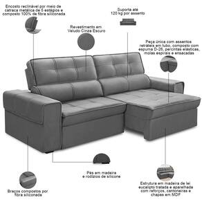 Altura: 106 cm | Peso: 65 Kg | Orientação do Sofá: Frontal | Mecanismo de abertura do produto: Manual, rodízios de silicone | Material do estofamento: Veludo | Material de enchimento do encosto: Fibra Siliconada | Linha: Sala de Estar | Formato do sofá: Linear | Estilo: Moderno | Desenho do tecido: Liso | Fabricante: Lyam Decor | Densidade da espuma do assento: D-26 | Largura: 210 cm | Cor dos pés: Marrom | Profundidade: 113 cm | Quantidade de Caixas de embalagem: 1 | Peso máximo suportado: 240 kg | Requer montagem: Não | Unidades por kit: 1 | Tipo de produto: Sofá Retrátil Reclinável | Cor: Cinza Escuro