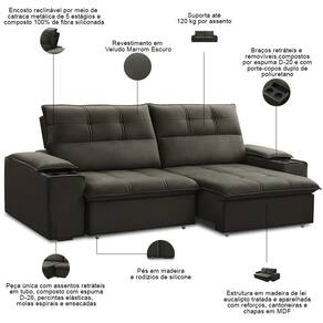 Quantidade de Caixas de embalagem: 1 | Orientação do Sofá: Frontal | Tipo de produto: Sofá Retrátil Reclinável | Material de enchimento do encosto: Fibra Siliconada | Estilo: Moderno | Peso: 60 Kg | Cor: Marrom Escuro | Cor dos pés: Marrom | Linha: Sala de Estar | Unidades por kit: 1 | Peso máximo suportado: 240 kg | Densidade da espuma do assento: D-26 | Formato do sofá: Linear | Requer montagem: Não | Material do estofamento: Veludo | Fabricante: Lyam Decor | Largura: 210 cm | Mecanismo de abertura do produto: Manual, rodízios de silicone | Altura: 110 cm | Profundidade: 98 cm | Desenho do tecido: Liso