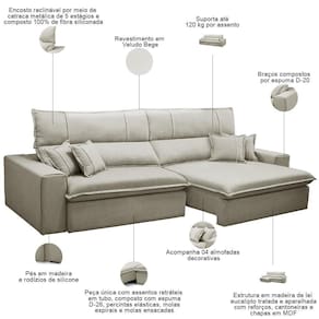 Unidades por kit: 1 | Cor: Bege | Requer montagem: Não | Altura: 115 cm | Tipo de produto: Sofá Retrátil Reclinável | Peso máximo suportado: 240 kg | Peso: 80 Kg | Orientação do Sofá: Frontal | Mecanismo de abertura do produto: Manual, rodízios de silicone | Material do estofamento: Veludo | Material de enchimento do encosto: Fibra Siliconada | Linha: Sala de Estar | Formato do sofá: Linear | Estilo: Moderno | Desenho do tecido: Liso | Fabricante: Lyam Decor | Densidade da espuma do assento: D-26 | Largura: 230 cm | Cor dos pés: Marrom | Profundidade: 121 cm | Quantidade de Caixas de embalagem: 1