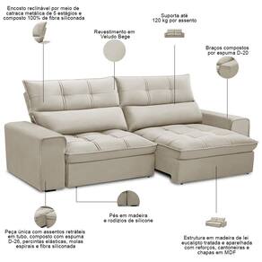 Unidades por kit: 1 | Cor: Bege | Requer montagem: Não | Altura: 110 cm | Tipo de produto: Sofá Retrátil Reclinável | Peso máximo suportado: 240 kg | Peso: 75 Kg | Orientação do Sofá: Frontal | Mecanismo de abertura do produto: Manual, rodízios de silicone | Material do estofamento: Veludo | Material de enchimento do encosto: Fibra Siliconada | Linha: Sala de Estar | Formato do sofá: Linear | Estilo: Moderno | Desenho do tecido: Liso | Fabricante: Lyam Decor | Densidade da espuma do assento: D-26 | Largura: 230 cm | Cor dos pés: Marrom | Profundidade: 95 cm | Quantidade de Caixas de embalagem: 1