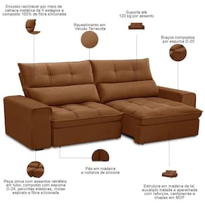 Requer montagem: Não | Unidades por kit: 1 | Tipo de produto: Sofá Retrátil Reclinável | Peso máximo suportado: 240 kg | Peso: 75 Kg | Orientação do Sofá: Frontal | Mecanismo de abertura do produto: Manual, rodízios de silicone | Material do estofamento: Veludo | Material de enchimento do encosto: Fibra Siliconada | Linha: Sala de Estar | Formato do sofá: Linear | Estilo: Moderno | Fabricante: Lyam Decor | Profundidade: 95 cm | Largura: 230 cm | Cor dos pés: Marrom | Cor: Terracota | Quantidade de Caixas de embalagem: 1 | Densidade da espuma do assento: D-26 | Desenho do tecido: Liso | Altura: 110 cm