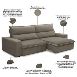 Altura: 110 cm | Color: Marrom Claro | ColorFamily: Marrom Claro | ColorSimple: Marrom Claro | ColorSupplier: Marrom Claro | Cor: Marrom Claro | Densidade da espuma do assento: D-26 | Desenho do tecido: Liso | Estilo: Moderno | Fabricante: Lyam Decor | Formato do sofá: Linear | Largura: 230 cm | Linha: Sala de Estar, Living | Material: Madeira de Eucalipto, Cantoneiras, Chapas em MDF | Material de enchimento do encosto: Fibra Siliconada | Material do estofamento: Veludo | MaterialFamily: Madeira de Eucalipto | Mecanismo de abertura do produto: Manual | Model: Senzi | Orientação do Sofá: Frontal | OriginCountry: Brasil | OriginState: PR | Peso: 74 kg | Peso máximo suportado: 360 kg | ProductContents: 01 Sofá | ProductHeight: 110 cm | ProductInstructions: Produto para uso em ambiente interno, nao devendo ficar exposto ao sol, calor e umidade excessivos. | ProductLength: 110 cm | ProductWarranty: 90 dias após o recebimento do produto | ProductWeight: 74 kg | ProductWidth: 230 cm | Profundidade: 110 cm | Quantidade de Caixas de embalagem: 1 | Requer montagem: Não | SizeDescription: Altura: 110 cm x Largura: 230 cm x Profundidade: 110 cm | SupplierSimpleName: Sofá Retrátil Reclinável Para Sala 3 Lugares 230cm Senzi F04 Veludo Marrom Claro - Lyam Decor | Tipo de produto: Sofá Retrátil Reclinável | Unidades por kit: 1
