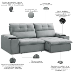Cor: Cinza claro | Requer montagem: Não | Material de enchimento do encosto: Fibra Siliconada | Linha: Sala de Estar | Formato do sofá: Linear | Estilo: Moderno | Desenho do tecido: Liso | Fabricante: Lyam Decor | Densidade da espuma do assento: D-26 | Largura: 230 cm | Cor dos pés: Marrom | Profundidade: 98 cm | Quantidade de Caixas de embalagem: 1 | Unidades por kit: 1 | Tipo de produto: Sofá Retrátil Reclinável | Mecanismo de abertura do produto: Manual, rodízios de silicone | Altura: 110 cm | Peso máximo suportado: 240 kg | Orientação do Sofá: Frontal | Material do estofamento: Veludo | Peso: 70 kg