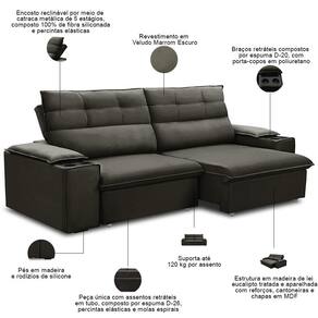 Cor: Marrom Escuro | Unidades por kit: 1 | Requer montagem: Não | Tipo de produto: Sofá Retrátil Reclinável | Altura: 110 cm | Peso máximo suportado: 240 kg | Peso: 80 Kg | Orientação do Sofá: Frontal | Mecanismo de abertura do produto: Manual, rodízios de silicone | Material do estofamento: Veludo | Material de enchimento do encosto: Fibra Siliconada | Linha: Sala de Estar | Formato do sofá: Linear | Estilo: Moderno | Fabricante: Lyam Decor | Desenho do tecido: Liso | Densidade da espuma do assento: D-26 | Largura: 245 cm | Cor dos pés: Marrom | Profundidade: 98 cm | Quantidade de Caixas de embalagem: 1
