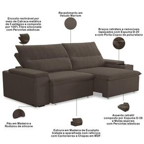 Altura: 110 cm | Color: Marrom | ColorFamily: Marrom | ColorSimple: Marrom | ColorSupplier: Marrom | Cor: Marrom | Densidade da espuma do assento: D-26 | Desenho do tecido: Liso | Estilo: Moderno | Fabricante: Lyam Decor | Formato do sofá: Linear | Largura: 245 cm | Linha: Sala de Estar, Living | Material: Madeira de Eucalipto, Cantoneiras, Chapas em MDF | Material de enchimento do encosto: Fibra Siliconada | Material do estofamento: Veludo | MaterialFamily: Madeira de Eucalipto | Mecanismo de abertura do produto: Manual | Model: Ricci | Orientação do Sofá: Frontal | OriginCountry: Brasil | OriginState: PR | Peso: 80 Kg | Peso máximo suportado: 360 kg | ProductContents: 01 Sofá | ProductHeight: 110 cm | ProductInstructions: Produto para uso em ambiente interno, nao devendo ficar exposto ao sol, calor e umidade excessivos. | ProductLength: 98 cm | ProductWarranty: 90 dias após o recebimento do produto | ProductWeight: 80 kg | ProductWidth: 245 cm | Profundidade: 98 cm | Quantidade de Caixas de embalagem: 1 | Requer montagem: Não | SizeDescription: Altura: 110 cm x Largura: 245 cm x Profundidade: 98 cm | SupplierSimpleName: Sofá Retrátil Reclinável Para Sala 3 Lugares 245cm Ricci F04 Veludo Marrom - Lyam Decor | Tipo de produto: Sofá Retrátil Reclinável | Unidades por kit: 1