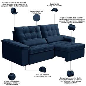 Formato do sofá: Linear | Unidades por kit: 1 | Cor: Azul | Requer montagem: Não | Altura: 110 cm | Tipo de produto: Sofá Retrátil Reclinável | Peso máximo suportado: 240 kg | Material do estofamento: Veludo | Material de enchimento do encosto: Fibra Siliconada | Desenho do tecido: Liso | Orientação do Sofá: Frontal | Peso: 90 kg | Densidade da espuma do assento: D-26 | Cor dos pés: Marrom | Profundidade: 121 cm | Linha: Sala de Estar | Fabricante: Lyam Decor | Largura: 250 cm | Mecanismo de abertura do produto: Manual, rodízios de silicone | Estilo: Moderno | Quantidade de Caixas de embalagem: 1